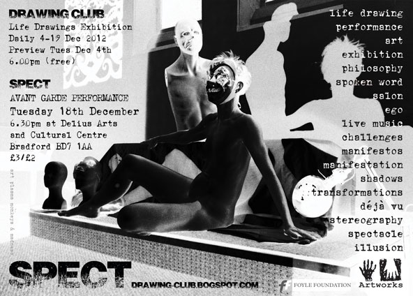 SPECT means "To Look". Our performance this December will include four artful installations by our artists. There will be life models, live music, three dimensional shadows, live life drawing and an exhibition of our work from the drawing club. SPECT will mystify and amaze in the cold, dark of the winter.